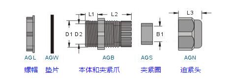若分開訂購各零件時(shí),請(qǐng)?jiān)谛吞?hào)后面加上各代號(hào):螺帽(L) 墊片(W) 本體(B) 夾緊圈(S) 迫緊頭(N)例:訂購AGJ-14螺帽,型號(hào)為AGJL-14。