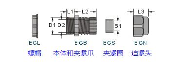 若分開訂購各零件時(shí),請(qǐng)?jiān)谛吞?hào)后面加上各代號(hào):螺帽(L) 墊片(W) 本體(B) 夾緊圈(S) 迫緊頭(N)例:訂購EG-7螺帽,型號(hào)為EGL-7。