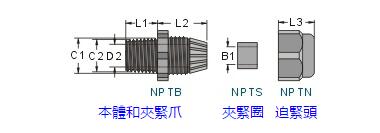 若分開訂購各零件時(shí),請(qǐng)?jiān)谛吞?hào)后面加上各代號(hào):本體(B) 夾緊圈(S) 迫緊頭(N)例:訂購NPT-14本體,型號(hào)為NPTB-14。